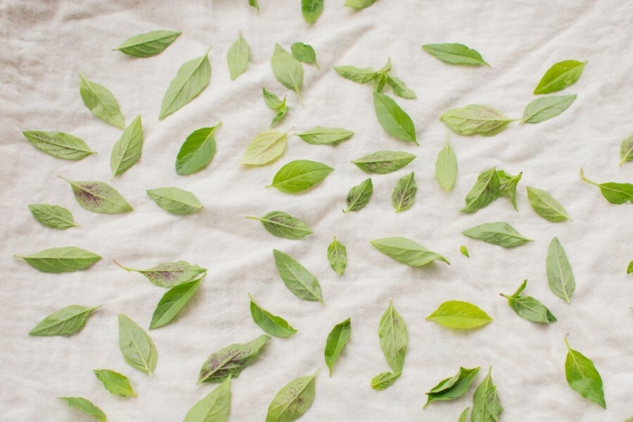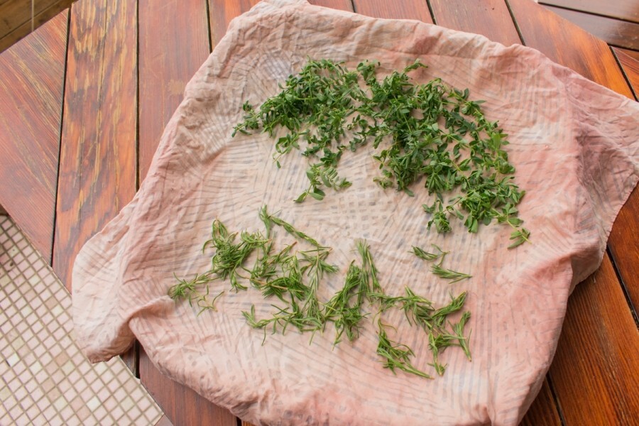 듬성듬성한 대나무 채반 위에 손수건을 널고 그 위에 허브를 얹어 말립니다. 바람이 세게 부는 날엔 보자기를 위에 덮고 집게로 집어놓아요.