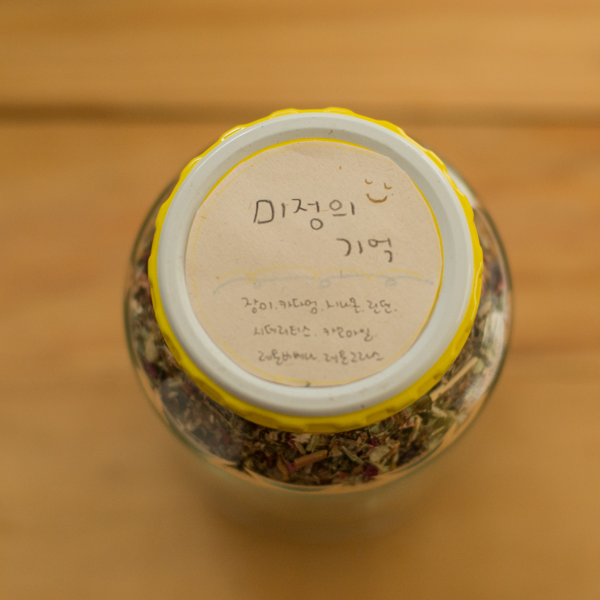 이렇듯 허브티블렌딩 자체는 수월하게 이어진 반면, 차의 이름을 정하기까지 꽤 오랜 시간이 걸렸습니다. 이름에 '기억'이 들어갔으면 좋겠다는 미정님의 아이디어를 전달받고 '기억'이 들어가는 노랫말, 시 구절 같은 것들을 한참 열심히 찾았는데요.. 어째선지 마음에 쏙 들어오는, 알맞은 무언가가 잘 나타나지 않았지요. 여러 단어들과 메모들로 어지럽게 채워진 공책을 넘겨서, 새하얀 빈 페이지에 ‘미정작업실’, ‘기억’, 이라는 두 단어를 적고 가만히 들여다보니 문득, 단순하고 담담하게 그저 '미정의 기억'이라는 이름을 붙이면 어떨까.. 싶었습니다. 1) '미정작업실'에서의 기억, 2) 미정님과의 기억이기도 하면서, 3) 미정작업실 공간 설명으로부터 아이디어를 빌려 적자면, 아직 '미정'인, 정해지지 않은, 미래의 기억까지 의미합니다.